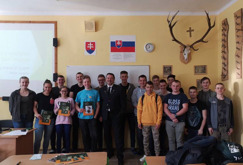 Šéfredaktor LES a Letokruhy a lesný pedagóg Peter Gogola medzi študentmi Strednej odbornej lesníckej a drevárskej školy Jozefa Dekreta Matejovie v Liptovskom Hrádku