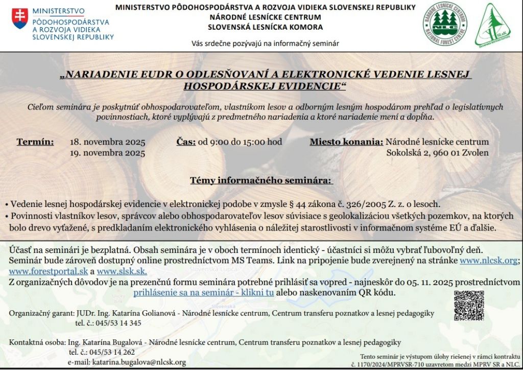 Seminár sa uskutoční 18. novembra a 19. novembra 2025 v Národnom lesníckom centre - Sokolská 2 vo Zvolene alebo online prostredníctvom MS Teams. Účasť na seminári je bezplatná, účastníci si môžu vybrať ktorýkoľvek termín konania seminára, obsah seminára je počas obidvoch dní identický a koná sa v čase od 9. do 15. hodiny.
