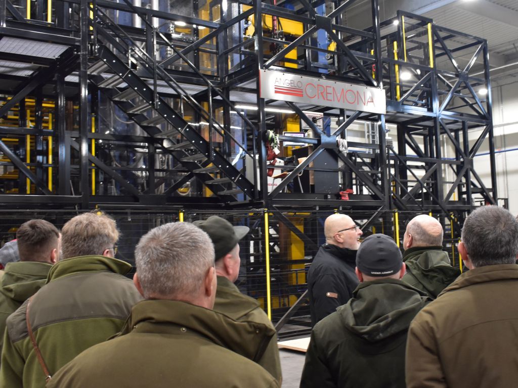 Ing. Václavik (v strede) ukazuje lesníkom počas exkurzie novú lisovaciu robotickú linku v DYAS EU