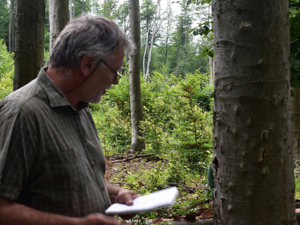 Ing. Milan Zúbrik, PhD. z Lesníckej ochranárskej služby pri buku napadnutom lykožrútom bukovým