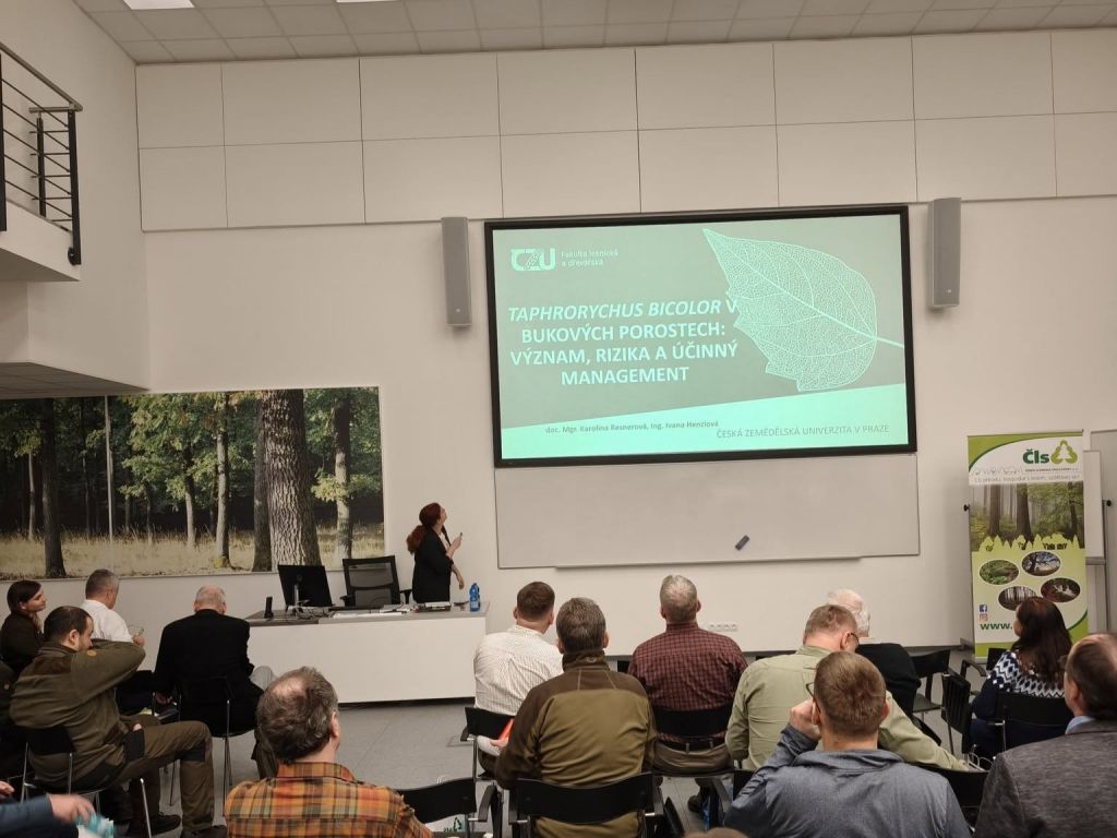 Doc. Mgr. Bc. Karolína Resnerová, Ph.D. posluchačům odhalila zajímavé téma „Taphrorychus bicolor v bukových porostech: význam, rizika a účinný management“. Tento drobný kůrovec se na našem území běžně vyskytuje, ale dlouho byl přehlížen. Vyskytuje se v těžebním odpadu i v dospělých bucích, na kterých se ve větší míře objevil v posledních letech a vzbudil pozornost lesníků.