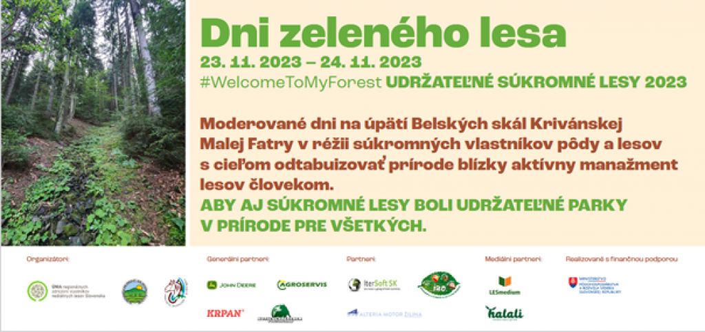 ÚNIA regionálnych združení vlastníkov neštátnych lesov Slovenska, Partnerstvo pre Prírodný Park Krivánska Malá Fatra a Asociácia furmanov Slovenska organizujú 23. a 24. novembra v areáli Hájovne Belá pri Varíne v okrese Žilina akciu nazvanú Dni zeleného lesa #WelcomeToMyForest UDRŽATEĽNÉ SÚKROMNÉ LESY 2023.