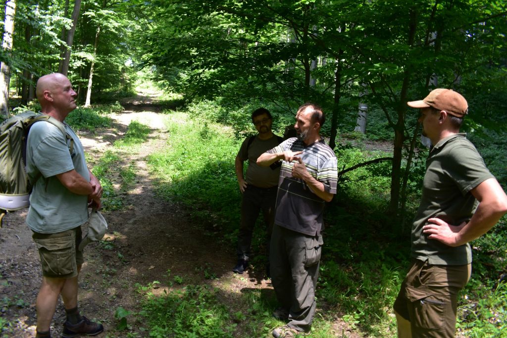Dušan Mikuš (druhý sprava) vysvetľuje kolegom lesnícke postupy na Lesnej správe Duchonka