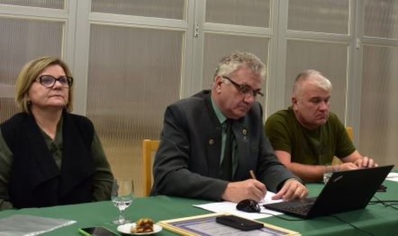 Vpravo Ing. Peter Zima, 2. podpredseda Slovenskej lesníckej komory, v strede predseda Ing. Igor Viszlai a vľavo 1. podpredsedníčka Ing. Mária Biesová na výročnom zasadnutí Slovenskej lesníckej komory