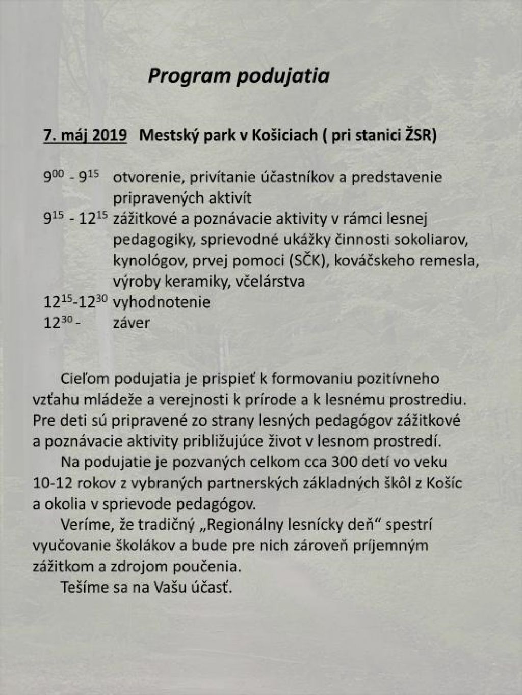 Celé podujatie sa skončí v rovnakom duchu ako ostatné regionálne lesnícke dni v Mestskom parku v Košiciach pri železničnej stanici v utorok 7. mája. Organizátormi regionálneho Lesníckeho dňa v metropole východného Slovenska sú Mestské lesy Košice a štyri odštepné závody š. p. LESY SR – Košice, Prešov, Rožňava a Sobrance.
