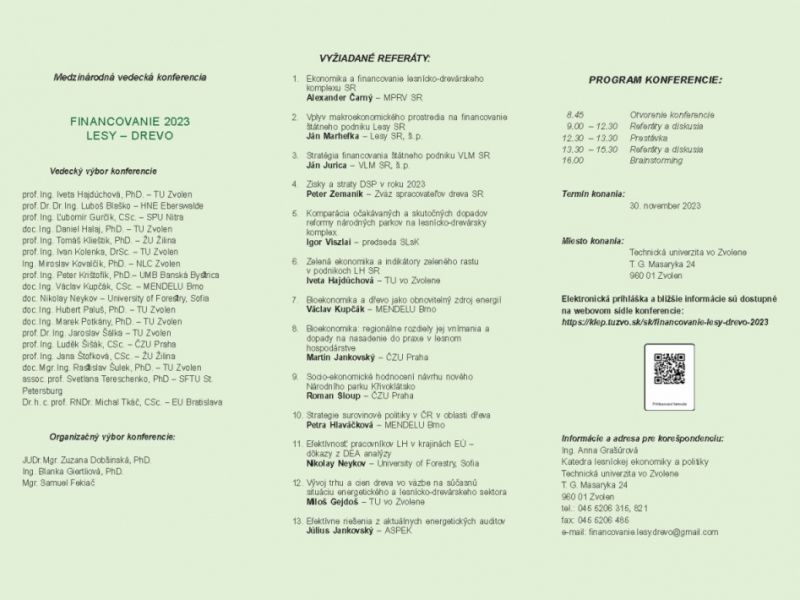 „Ide o jedno z najvýznamnejších vedecko-odborných podujatí, ktoré dlhodobo organizuje Katedra lesníckej ekonomiky a politiky Lesníckej fakulty Technickej univerzity vo Zvolene s cieľom poukázať na širšie súvislosti financovania podnikov v lesnícko-drevárskom komplexe.