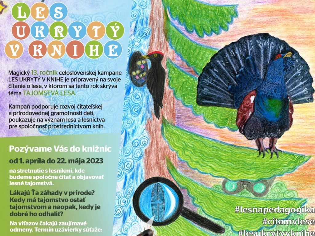 „TAJOMSTVÁ LESA sú ústrednou témou aktuálneho ročníka, ktorý bude prebiehať od 1. apríla do 22. mája 2023. Apríl, mesiac lesov, každoročne prináša les do knižníc na celom Slovensku, kde žiaci základných škôl spolu s lesnými pedagógmi hľadajú súvislosti medzi lesom a knihou prostredníctvom celoslovenskej kampane LES UKRYTÝ V KNIHE.