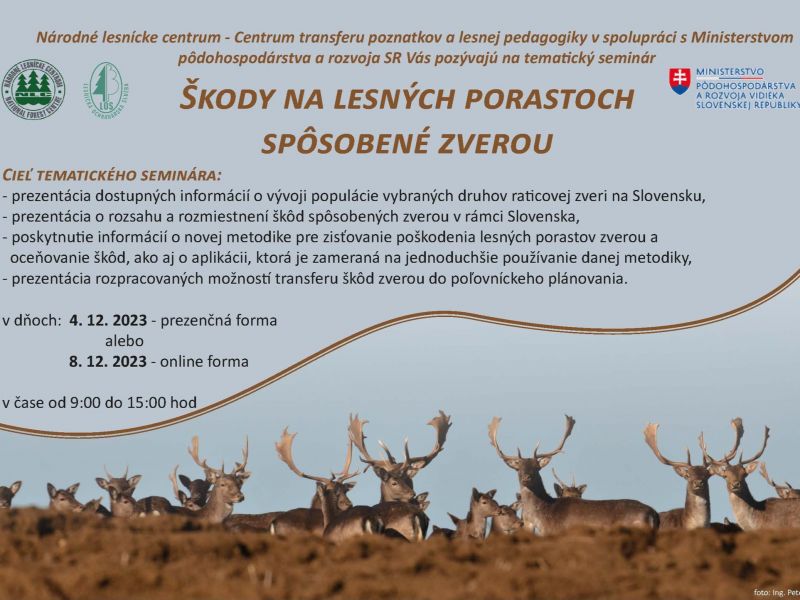 Národné lesnícke centrum - Centrum transferu poznatkov a lesnej pedagogiky v spolupráci s Ministerstvom pôdohospodárstva a rozvoja vidieka SR organizuje tematický seminár pod názvom Škody na lesných porastoch spôsobené zverou. NLC o tom informuje na sociálnej sieti.