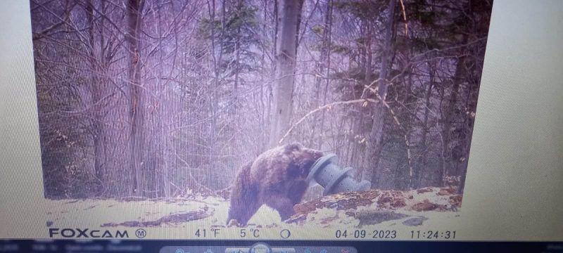 1, Nie je pravda, že nešťastný medveď sa trápil 17 dní. Trápil sa oveľa dlhšie, asi 42 dní. Svedčí o tom táto snímka, ktorá ho zachytáva 9.4.2023 - jeden až dva dni po tom, ako vopchal hlavu do suda s krmivom. Je tu v plnej kondícii.