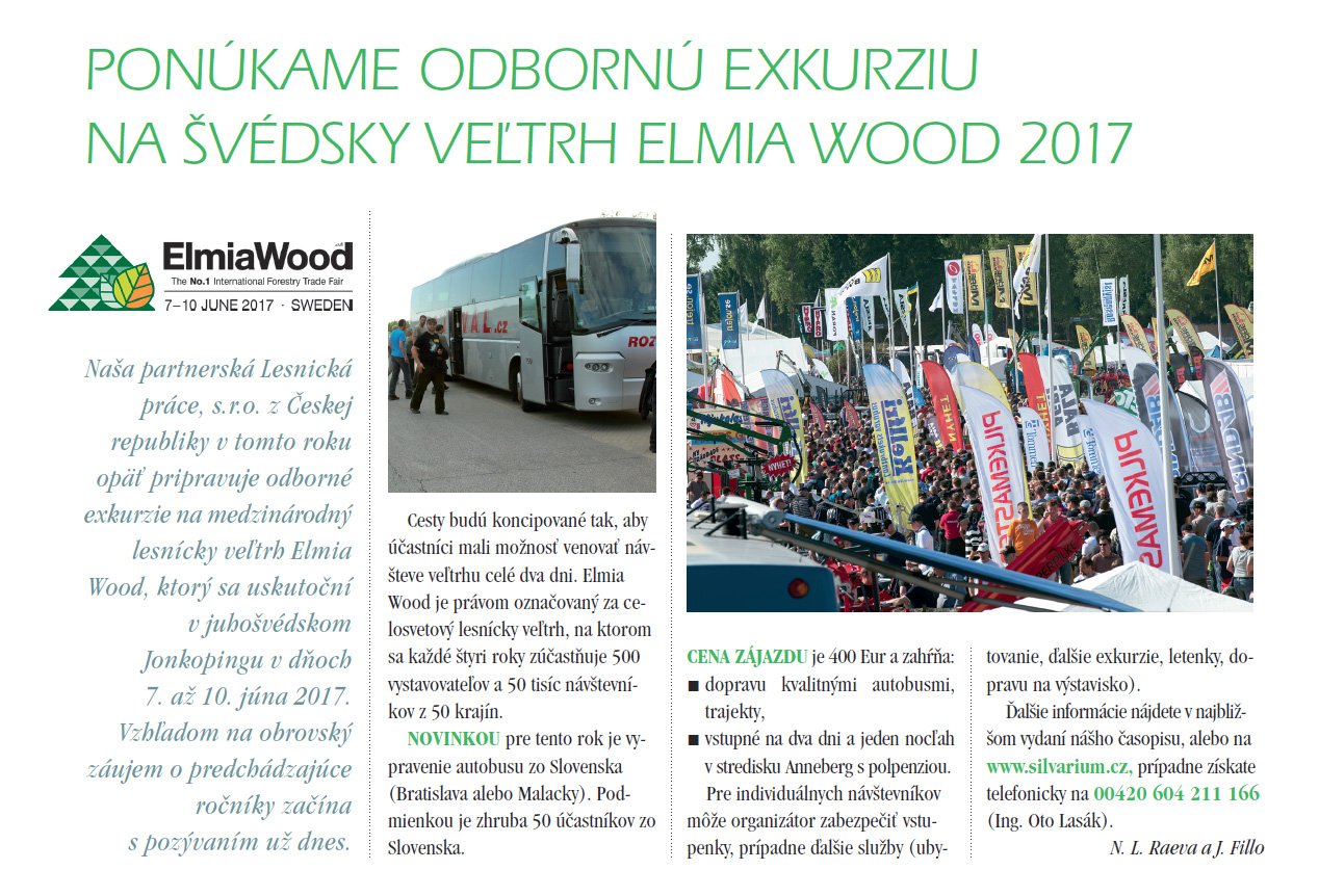 Aktualizované 15.5. Redakcia nášho partnerského časopisu Lesnická práce pripravila odbornú exkurziu na lesnícky veľtrh Elmia Wood 2017. S ohľadom na veľký záujem bude vypravený tretí autobus z Trenčína. Odchod vo štvrtok 8.6. a návrat v nedeľu na poludnie(Oto Lasák, Lesnická práce).