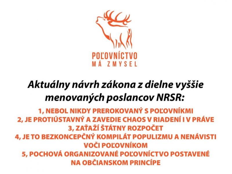 Ďalej požadujú riadny návrh zákona, ktorý bude transparentne pripravený spoluprácou všetkých zainteresovaných strán zástupcov poľovníkov, lesníkov, poľnohospodárov, veterinárov, ochrancov prírody, odborných inštitúcií, vedcov a samosprávy.
