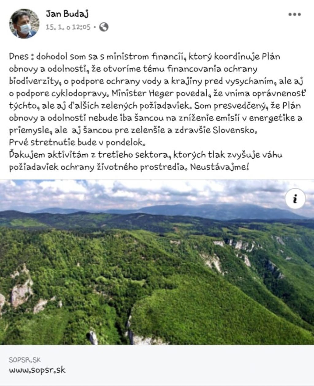 Včera na svojom FB profile informoval minister Ján Budaj o rokovaniach s ministrom financii ohľadom Plánu obnovy. Na konci poďakoval tretiemu sektoru za "zvýšenie váhy požiadaviek ochrany životného prostredia". Vo svojom príspevku použil fotku Muránskej planiny, na ktorej je krásne vidieť dlhodobú starostlivosť miestnych ľudí o toto vzácne územie.