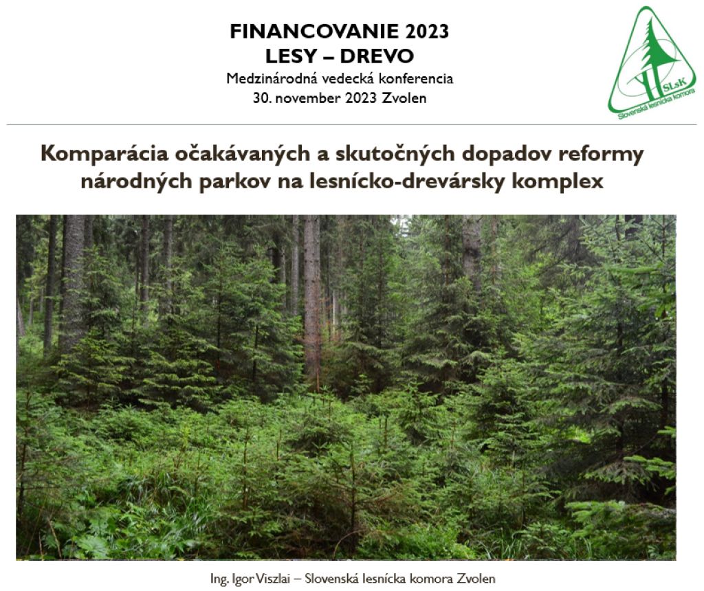 Slovenská lesnícka komora na svojej internetovej stránke informuje o prezentácii predsedu tejto lesníckej stavovskej organizácie Ing. Igora Viszlaia na medzinárodnej vedeckej konferencii FINANCOVANIE 2023 LESY – DREVO, ktorá sa uskutočnila 30. novembra vo Zvolene. Prezentácia mala názov Komparácia očakávaných a skutočných dopadov reformy národných parkov na lesnícko-drevársky komplex a autor v nej porovnával deklarované prínosy reformy národných parkov s realitou.