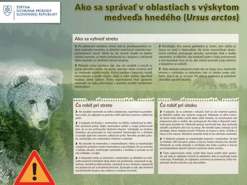 „Medveď sa zvyčajne snaží ľuďom vyhnúť, niekedy si nás ale všimnúť nemusí. V lese a jeho blízkosti treba byť preto ostražitý, predovšetkým ráno, večer a v noci, ale tiež počas dňa v hustej vegetácii alebo blízko zdrojov potravy. Vyhnúť sa neočakávanému stretu s medveďom pomôže aj schopnosť rozpoznať pobytové znaky a najčastejšiu potravu medveďa.