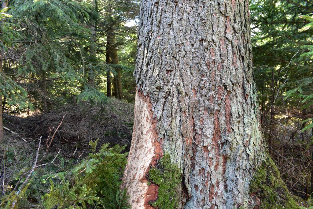 Jedľa ohryzená bobrom, ktorá postupne vyschne a lesníci ju budú musieť vyrezať