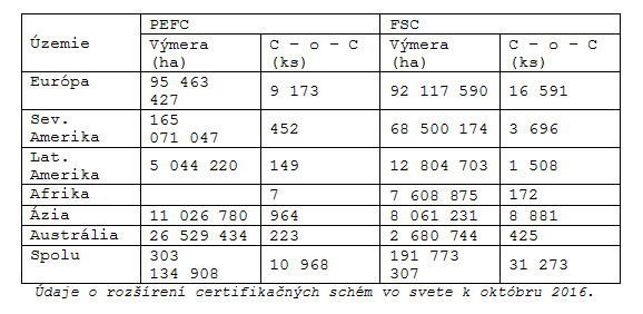 S procesom certifikácie lesov ako nástrojom ich trvalo udržateľného obhospodarovania sa stretávame už viac ako 20 rokov. Počas tohto obdobia sa postupným vývojom etablovali dve rozhodujúce certifikačné schémy FSC a PEFC. Podľa aktuálnych štatistických údajov je vo svete certifikovaných podľa schémy PEFC 303 mil. ha lesov a podľa schémy FSC 192 mil. ha lesov. Držiteľom spotrebiteľského reťazca PEFC je 10 968 firiem a spotrebiteľského reťazca FSC 31 273 firiem. Schémy sa navzájom líšia formou usporiadania,chápaním trvalo udržateľnosti pri obhospodarovaní lesov a používanými marketingovými metódami.