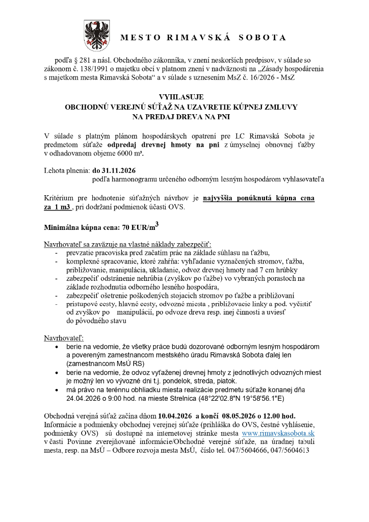 Mesto Rimavská Sobota vyhlasuje verejnú obchodnú súťaž na uzatvorenie kúpnej zmluvy na predaj dreva na pni v objeme 6000 m3. Min. kúpna cena je 70 EUR/m3. Viac informácii na https://www.rimavskasobota.sk/obchodne-verejne-sutaze.html