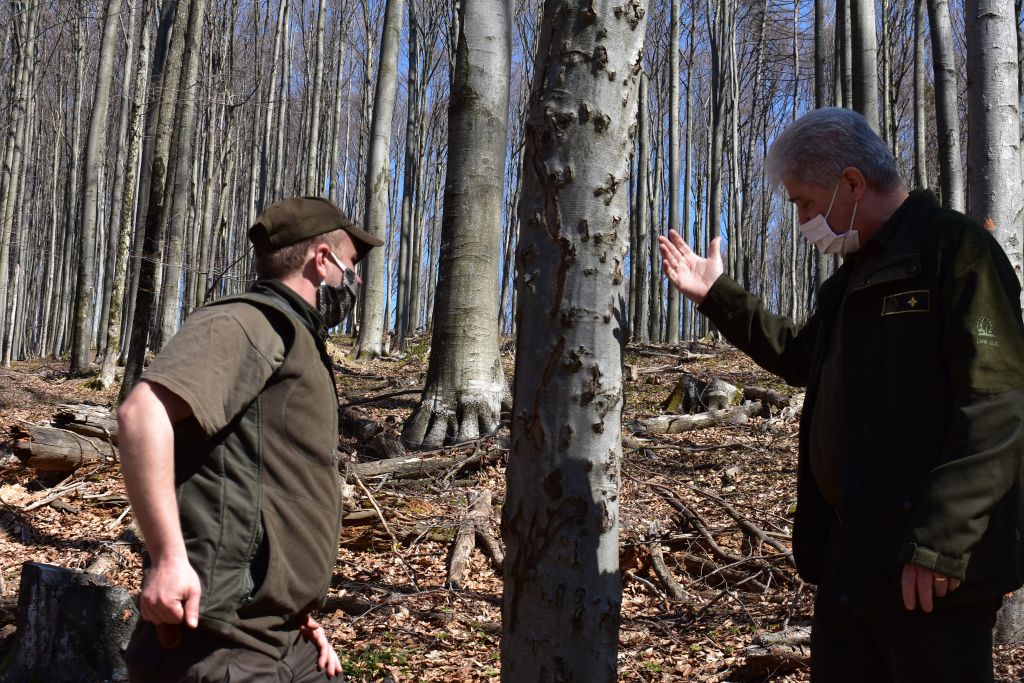 Ing. Peter Šiška (vpravo) a Ing. Ivan Šoltýs pri buku silne napadnutom lykožrútom bukovým