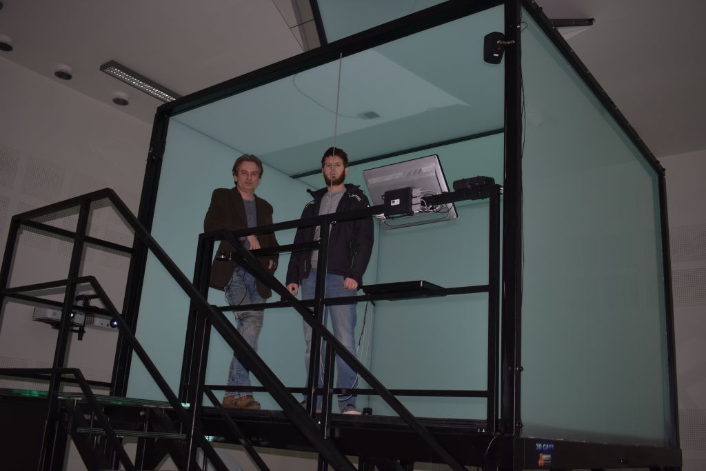 Prof. Marek Fabrika (vľavo) vo virtuálnej jaskyni s kolegom Ing. Petrom Valentom ešte ako vedúci Katedry plánovania lesných zdrojov a informatiky LF TUZVO