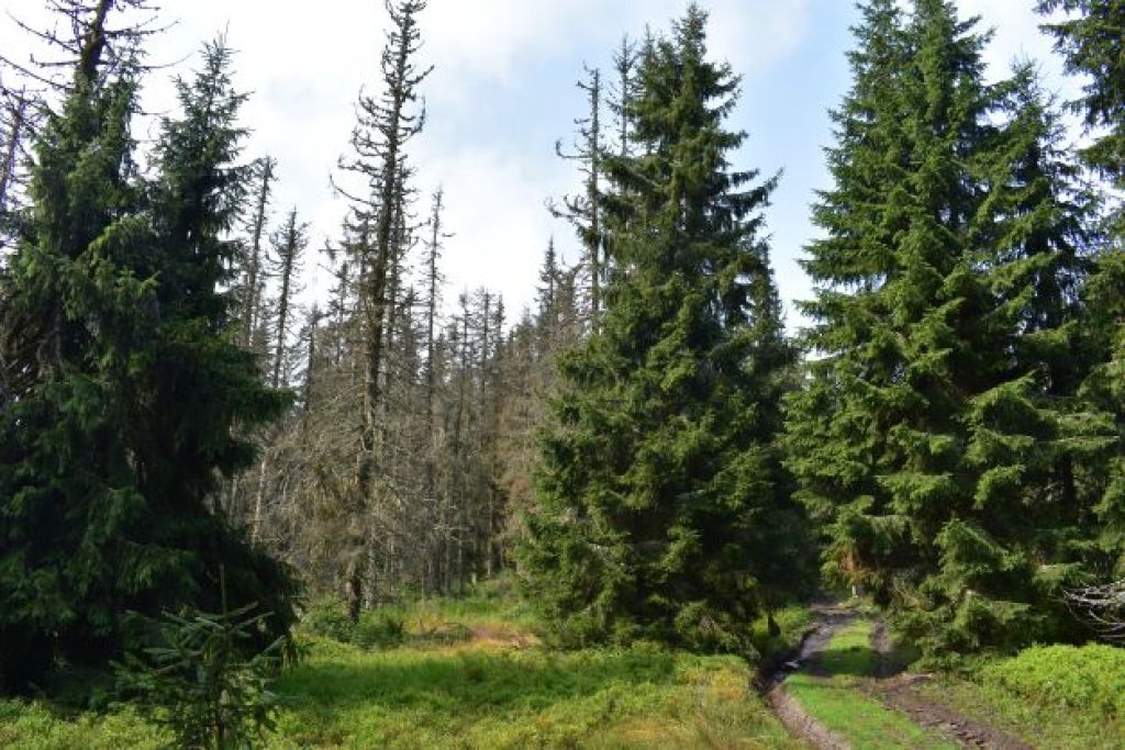 Vpravo od cesty zelený porast Spišského biskupstva. Vľavo sucháre v poraste ponechanom napospas podkôrnemu hmyzu