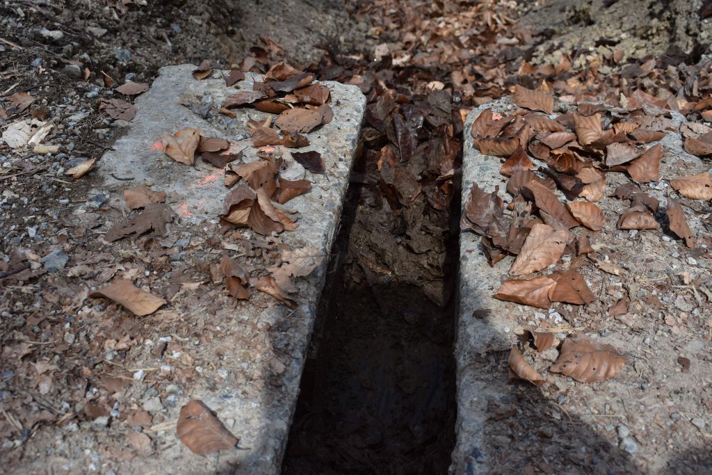 Žľab na odvádzanie vody je vytvorený zo štyroch betónových podvalov, osadených tak, že dva sú na jednej a dva na druhej strane. Medzi nimi sú v strede a na oboch krajoch umiestnené tri železné účka, ktoré zabraňujú tomu, aby pod tlakom nákladných áut, naložených drevom, dochádzalo k natlačeniu jedného podvalu k druhému.