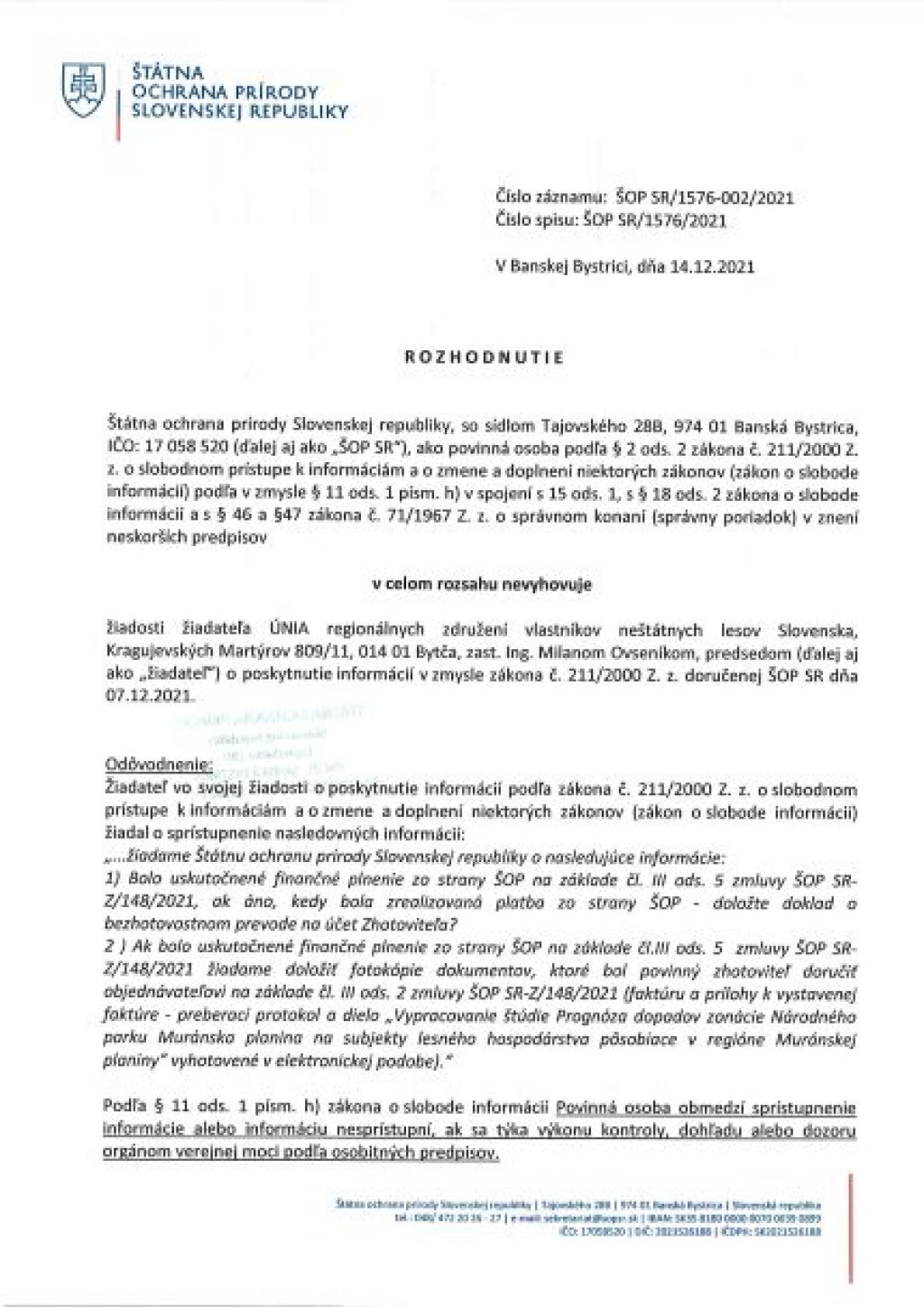 Prvá strana citovaného rozhodnutia ŠOP SR o nesprístupnení informáccií pre ÚNIu regionálnych združení vlastníkov neštátnych lesov Slovenska