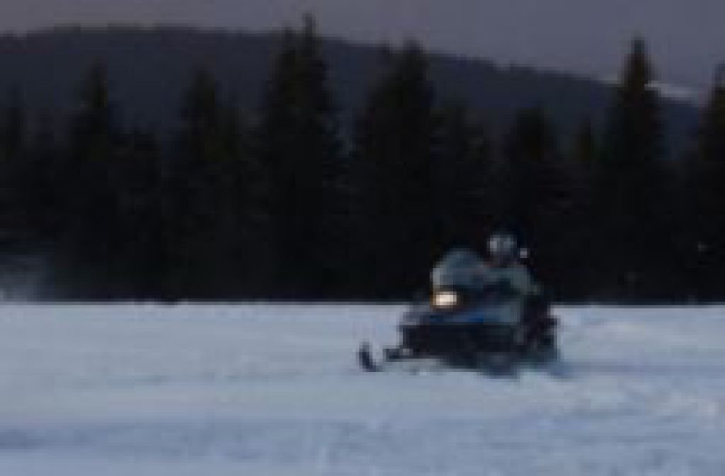 Strážcovia prírody a polícia idú po jazdcoch na snežných skútroch.