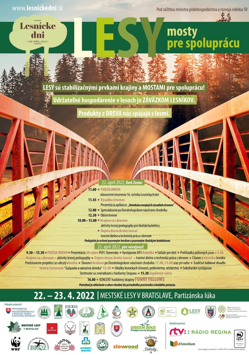 „Témou 16. ročníka celoslovenského podujatia Lesníckych dní je LESY mosty pre spoluprácu. 23. apríla 2022 sme pre verejnosť pripravili zaujímavý program Poézia dreva, naplnený aktivitami z dielne lesnej pedagogiky, práce s drevom, interaktívnym čítaním a príjemnou zábavou v Mestských lesoch v Bratislave na Partizánskej lúke,“ uvádza NLC v aktuálnom statuse.
