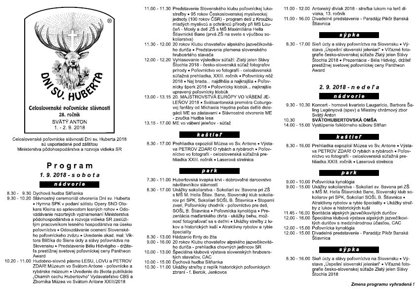 Vo Sv. Antone sa 1. a 2. septembra uskutočnia 28. Celoslovenské poľovnícke slávnosti - Dni sv.Huberta, najväčší sviatok poľovníkov na Slovensku.
