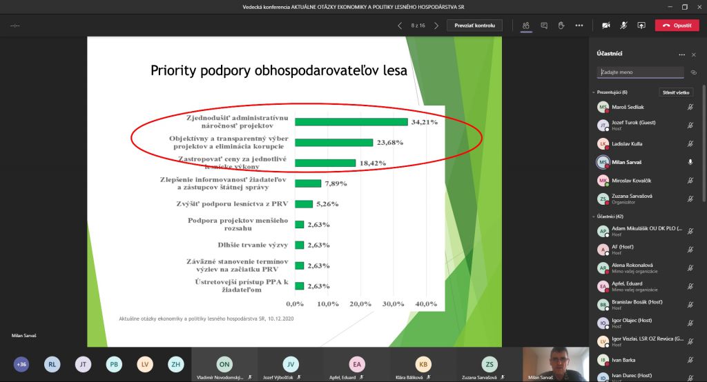 Vo štvrtok 10. decembra sa uskutočnil už 19. ročník tradičného podujatia na Národnom lesníckom centre, Aktuálne problémy ekonomiky a politiky lesného hospodárstva SR. Tohtoročná vedecká konferencia sa uskutočnila vo vážnej pandemickej situácii formou on line prezentácií. Ing. Peter Balogh, PhD., generálny riaditeľ Národného lesníckeho centra podčiarkol vo svojom príhovore význam konferencie. Uviedol, že konferencia dlhodobo patrí medzi najvýznamnejšie aktivity, pomocou ktorej NLC poskytuje priestor odbornej verejnosti na prerokovanie aktuálnych otázok, súvisiacich s ekonomikou a politikou lesného hospodárstva.