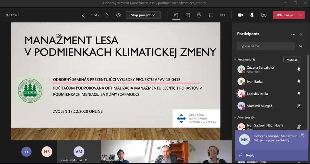 Na záver riešenia projektu APVV-15-0413, Počítačom podporovaná optimalizácia manažmentu lesných porastov v podmienkach meniacej sa klímy (CAFMOCC), sa 17. decembra uskutočnil online seminár, ktorý umožnil prediskutovať dosiahnuté výsledky projektu v kruhu odbornej verejnosti.