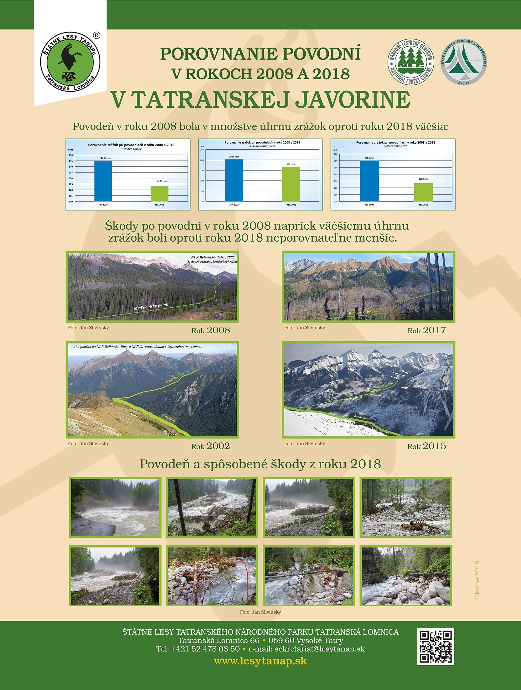 Pripravil niekoľko posterov, na ktorých prezentuje názorným a zrozumiteľným spôsobom to, čo znamená ponechanie spomenutých tatranských dolín, ktoré patria medzi najnavštevovanejšie v TANAP-e, na samovývoj a napospas lykožrútovi. Jedným z nich je plagát venovaný porovnaniu povodní v rokoch 2008 a 2018 v Tatranskej Javorine, ktorý pripájame v prílohe k článku.