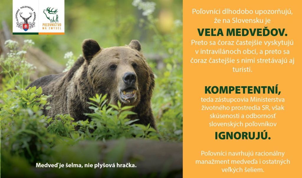 Na Slovensku by sa podľa polovníkov mal povoliť lov tejto šelmy, ktorá je v súčasnosti chránená. „Rovnako ako je to vo všetkých krajinách na svete. Nikde ochranári nezabíjajú medvede smrtiacou injekciou. Všade z jeho lovu profitujú miestne organizácie, len u nás na Slovensku stojí zabíjanie medveďov státisíce eur daňových poplatníkov. Všade vo svete sa medveď loví, len na Slovensku sa zabíja,“ vysvetľuje Slovenská poľovnícka komora.