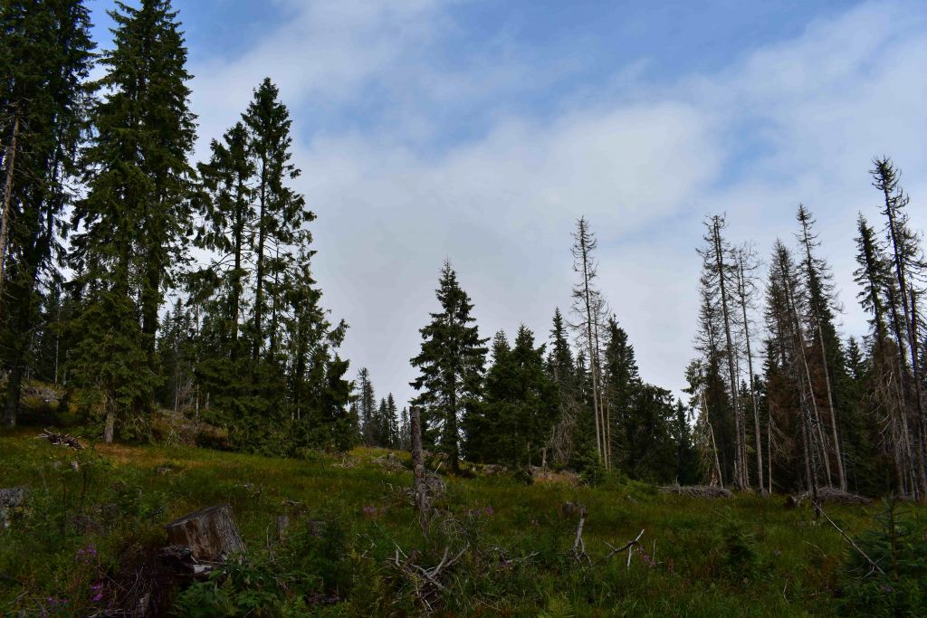 Mezi tím na dalších místech vznikaly holiny. Stromy napadené kůrovcem se kácely a tak les vystřídaly vyčnívající pařezy. Kácení navíc nemělo na zastavení šíření kůrovce příliš velký vliv. „Proto jsme tu v roce 2019 nechali stromy odumřít a nechali je tady stát, protože přeci jen stojící souš je z hlediska mikroklimatu pro tu plochu o něco málo příznivější, než je ta úplná holina," vysvětlil tehdejší kroky parku mluvčí. „Dnes je to dobře vidět. Po přehoření, po tom požáru je tady mnohem intenzivnější zmlazení než na holině, kde je zmrazení řidší," dodal Salov.