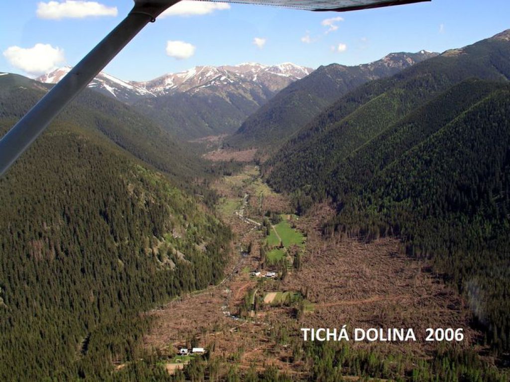 „To, čo vidíte, sú stromy vyvrátené počas veľkej vetrovej kalamity z 19. novembra 2004. Je to asi 30 000 stromov na ploche 105 ha. Naukladaných rovno vedľa asfaltovej cesty. Keby sa boli tieto stromy spracovali (alebo aspoň odkôrnili), mohli všetky okolité svahy ostať doteraz zelené a na kalamitných plochách už dávno mohli rásť nové stromčeky. No nespracovali sa a vďaka tomu vyschla v Tichej doline veľká väčšina starých smrekových porastov nad 50 rokov včítane veľkého množstva límb. Čiže to najvzácnejšie, čo sme tam v lese mali. Našťastie ich v tejto doline nebolo veľa. „Len“ asi 75 000 stromov na ploche 280 hektárov. Zelené ostali len lesy, vysadené po uzákonení TANAP-u lesníkmi. Či už na kalamitných plochách, vzniknutých počas druhej svetovej vojny, alebo na niekdajších pasienkoch.