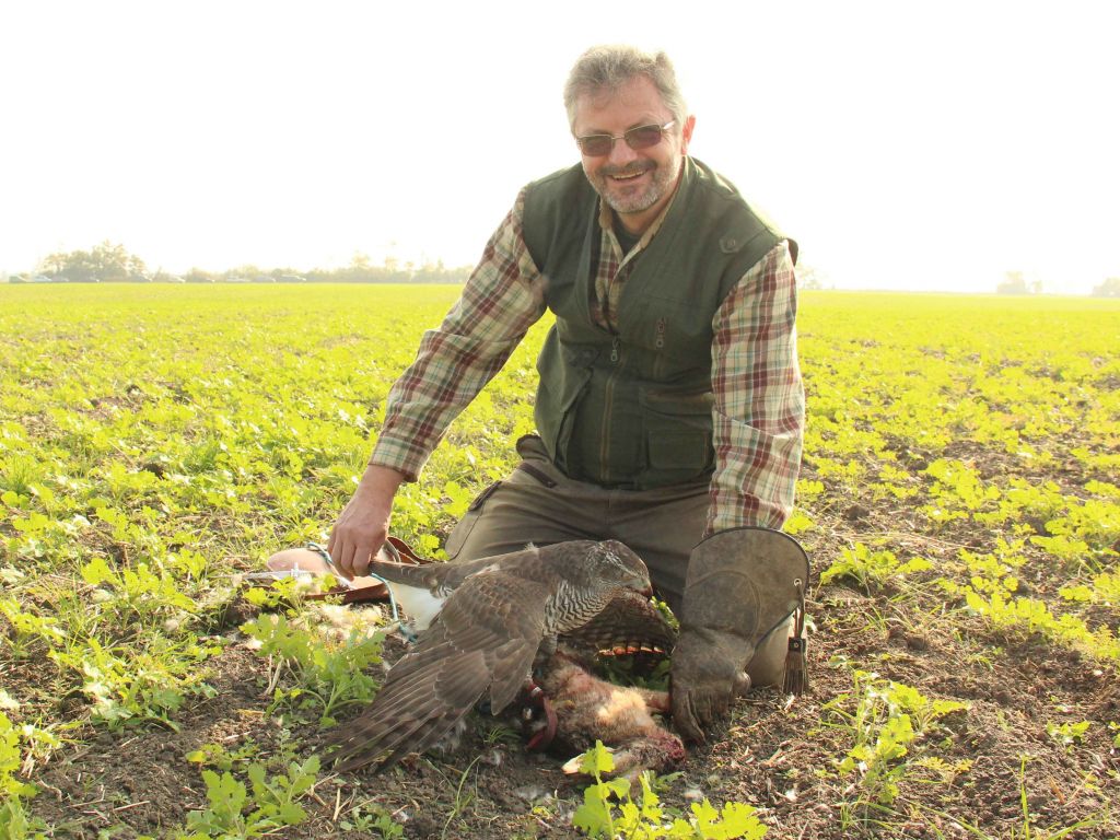 Ing. Alojz Kaššák ako sokoliar so svojim jastrabom a jeho úlovkom