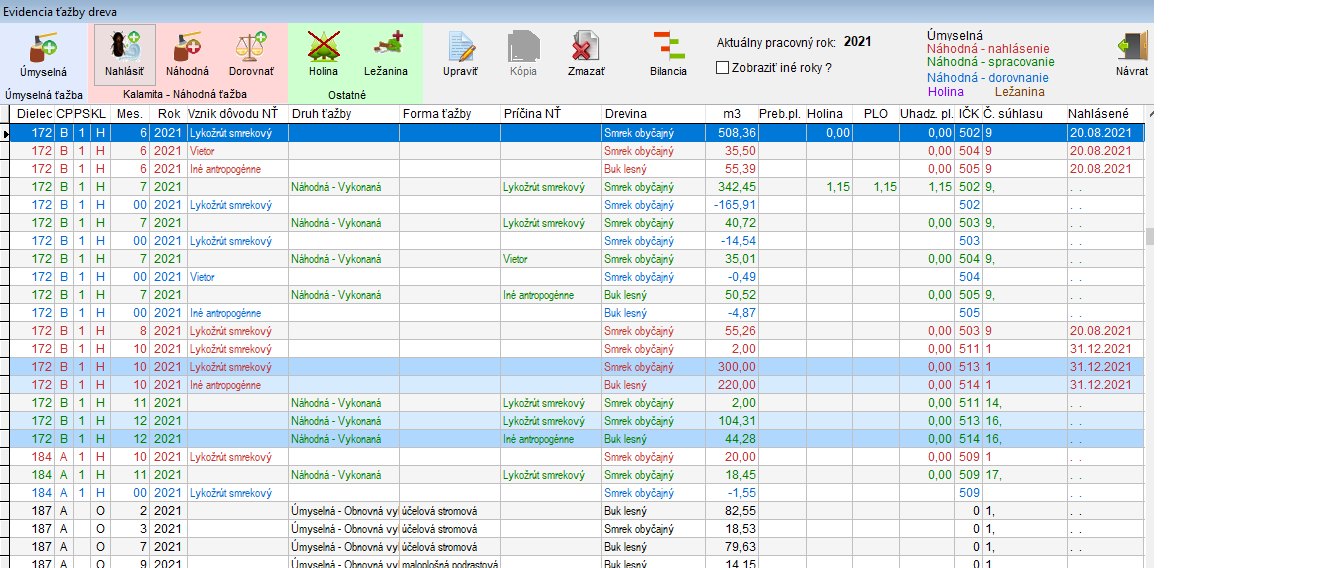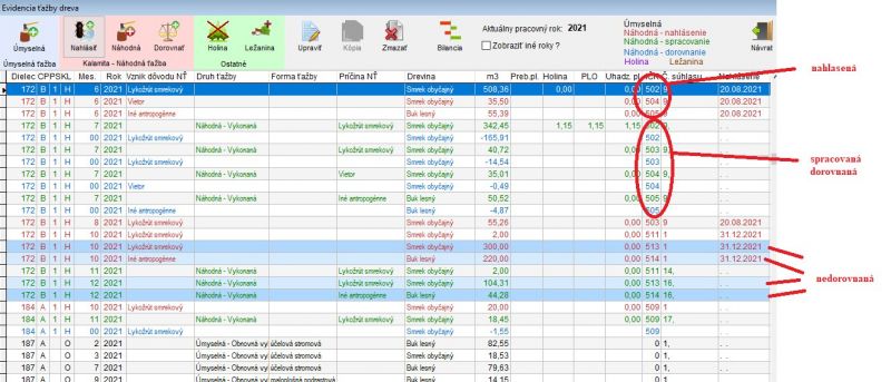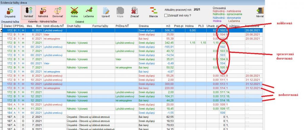 Na obrázkoch (fotografia a príloha k článku) vidíte záznamy červenou farbou, čo je nahlasená kalamita, zelenou je skutočné odevitovanie v príslušnom mesiaci a modrou je dorovnanie. Čiernou sú úmyselné ťažby. Prečo je to tak? Zase je to o prehľadnosti a o tom, aby sme vedeli, s ktorým údajom narábame. Každý riadok musí mať svoje ID - identifikačné číslo. Nestačí len pridelený súhlas na ťažbu. Každú drevinu, ktorú nahlásite, je nutné dorovnávať zvlášť, aby sme na nejakú nezabudli a neostala nám vidieť ako nespracovaná.