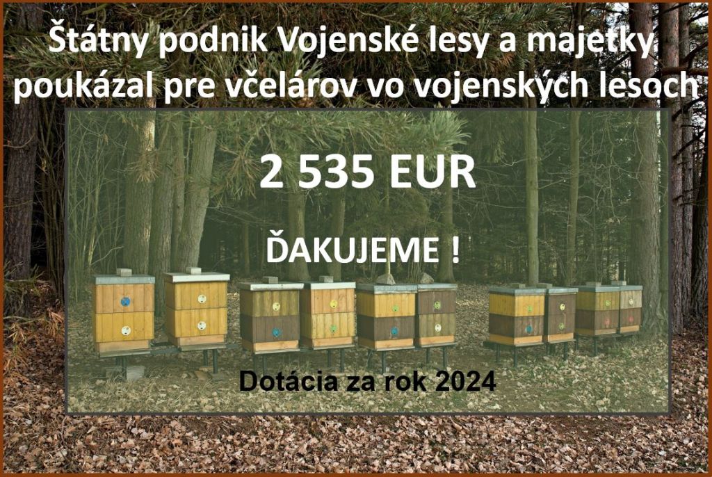 Včelárske múzeum v Kráľovej pri Senci na sociálnej sieti informuje, že Vojenské lesy a majetky SR, š.p. aj v roku 2024 pomohli včelárom, ktorí včelária vo vojenských lesoch. Slovenský zväz včelárov od roku 2021 túto finančnú pomoc prepláca všetkým, ktorí splnia podmienky pomoci. Vojenské lesy a majetky SR, š.p. prispeli podľa Včelárskeho múzea včelárom finančne sumou 15 eur/ročne na celkovo 169 včelích rodín.